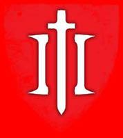 Герб г.п. Хотимск: «в красном поле» «варяжского» щита, серебряный меч рукояткой вверх, слева и справа от него две клямры, выступами на внешнюю сторону.